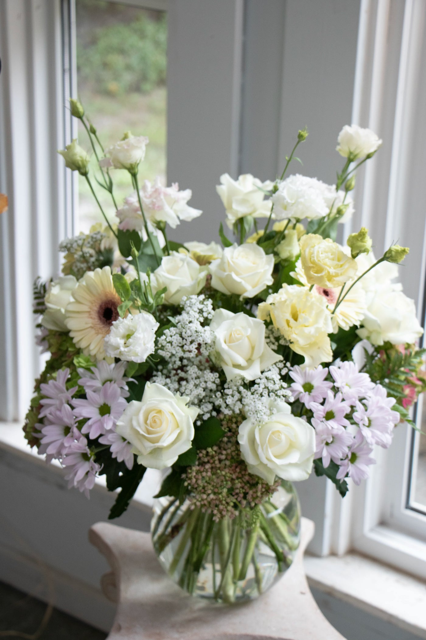 Each bouquet is thoughtfully arranged in a simple, elegant glass vase, using locally grown flowers, fresh from the market.